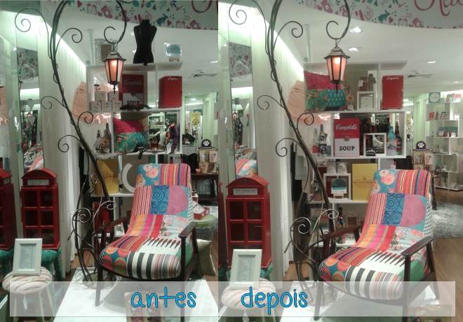 Peças maiores colocadas, hora de pensar nos produtos menores de forma a criar equilíbrio de volume e cor. No exemplo da vitrine da Coisas De Alice, um nicho pequeno foi colocado para “dar altura” aos produtos de banho para deixá-los proporcionais à almofada disposta ao lado. Observe também que objetos decorativos em patchwork foram dispostos na lateral oposta da almofada com a mesma proposta, na prateleira inferior, criando equilíbrio de cor. Cores fortes como amarelo, pink e vermelho precisam ser distribuídas ao longo do expositor (as estante, nesse caso) e intercaladas entre si para que não se formem áreas muito pesadas visualmente, que podem “apagar” produtos pequenos.